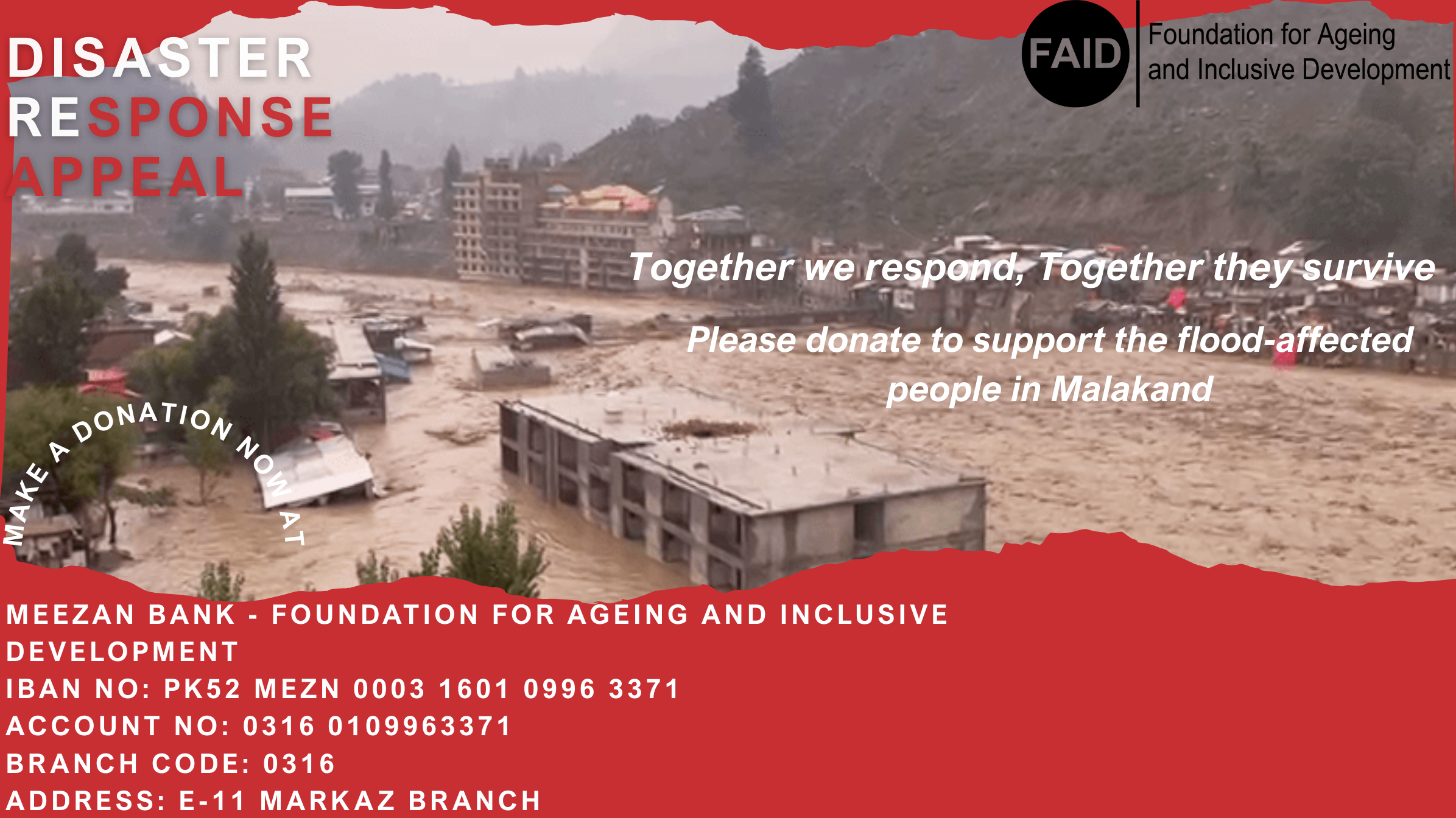 FAID (Foundation for Ageing and Inclusive Development) expresses deep concern over the catastrophic floods in Khyber Pakhtunkhwa, which have claimed 377 lives, including 294 men, 50 women, and 33 children and 1377 homes damaged(PDMA). Thousands have been displaced and are in urgent need of emergency shelter, food, clean water, hygiene items, and medical care. FAID is actively mobilizing resources to respond to this humanitarian crisis and urgently appeals to donors, partners, and the wider community to support its efforts. Your contribution can help save lives and restore hope for families in desperate need.
